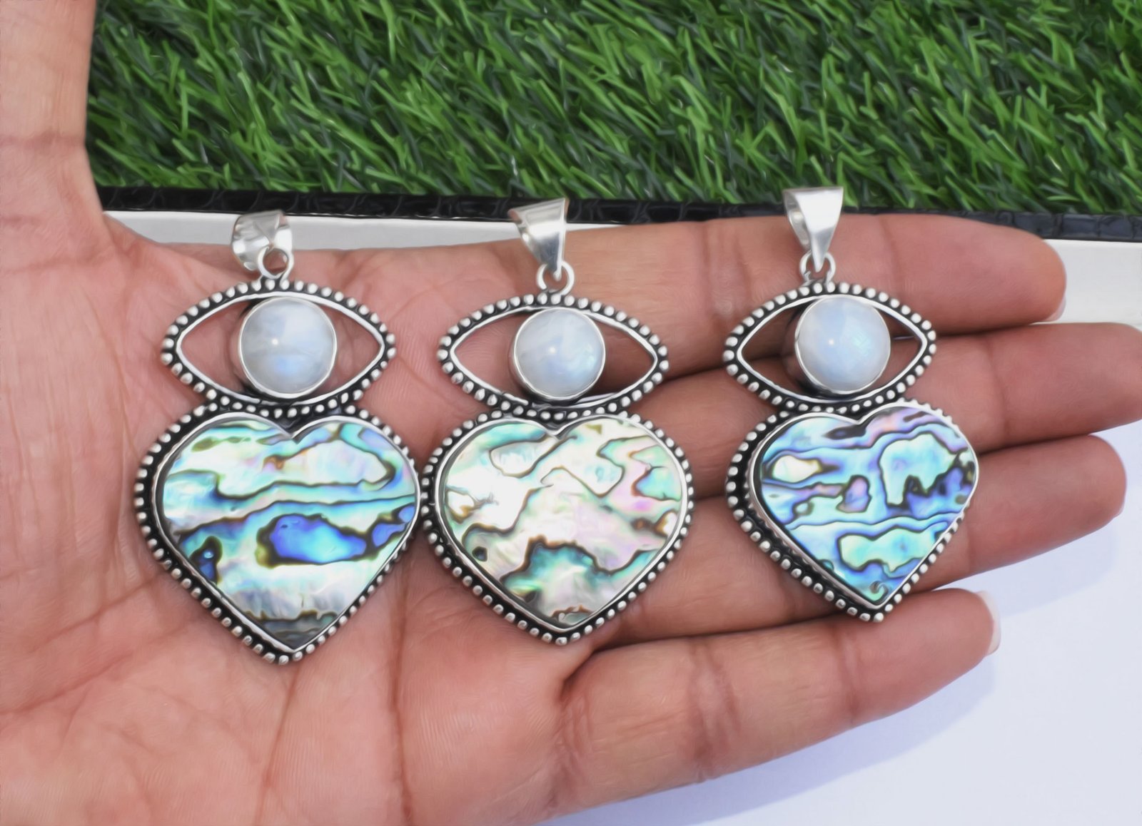Abalone Shell Heart with Evil Eye Moonstone Gemstone 925 Sterling Silver Pendants Handmade Pendants